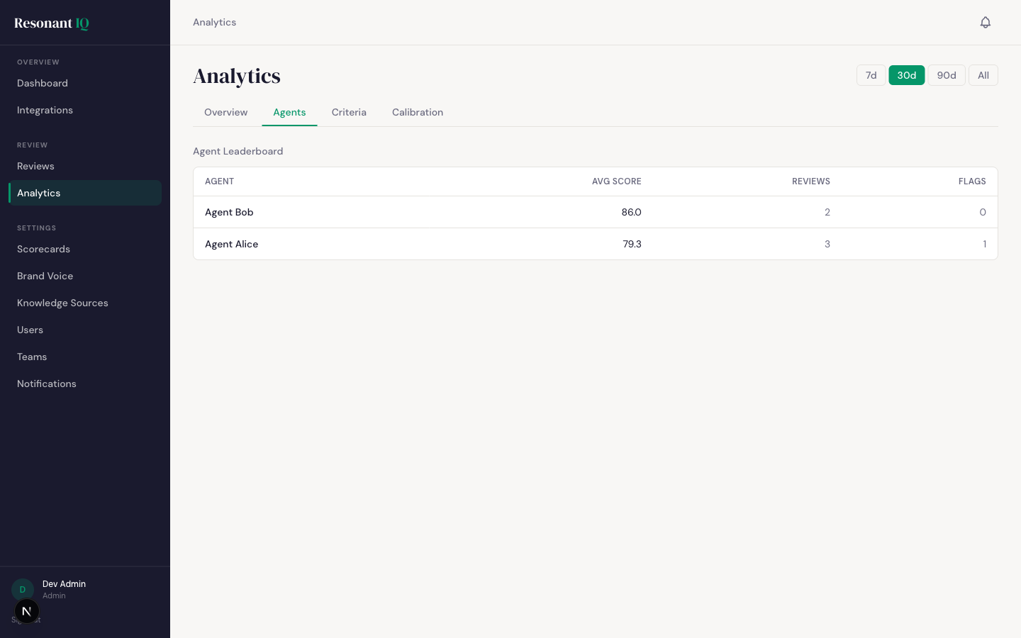 Score trends over time, agent leaderboard, lowest-scoring criteria (training gap signal), team comparisons, AI vs. human calibration view. Export to CSV or PDF for stakeholder reports.