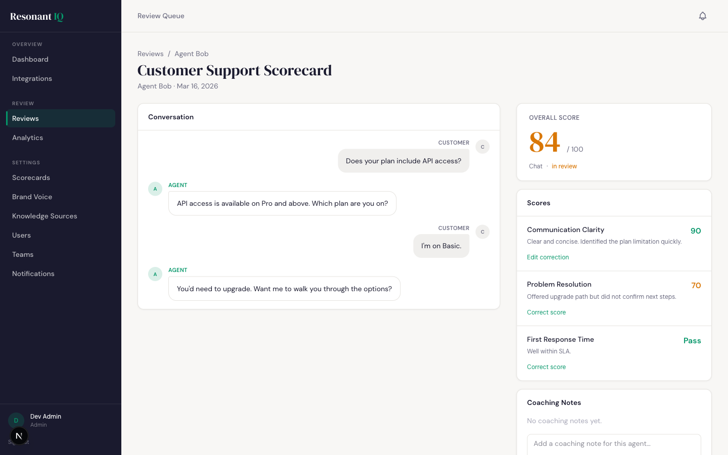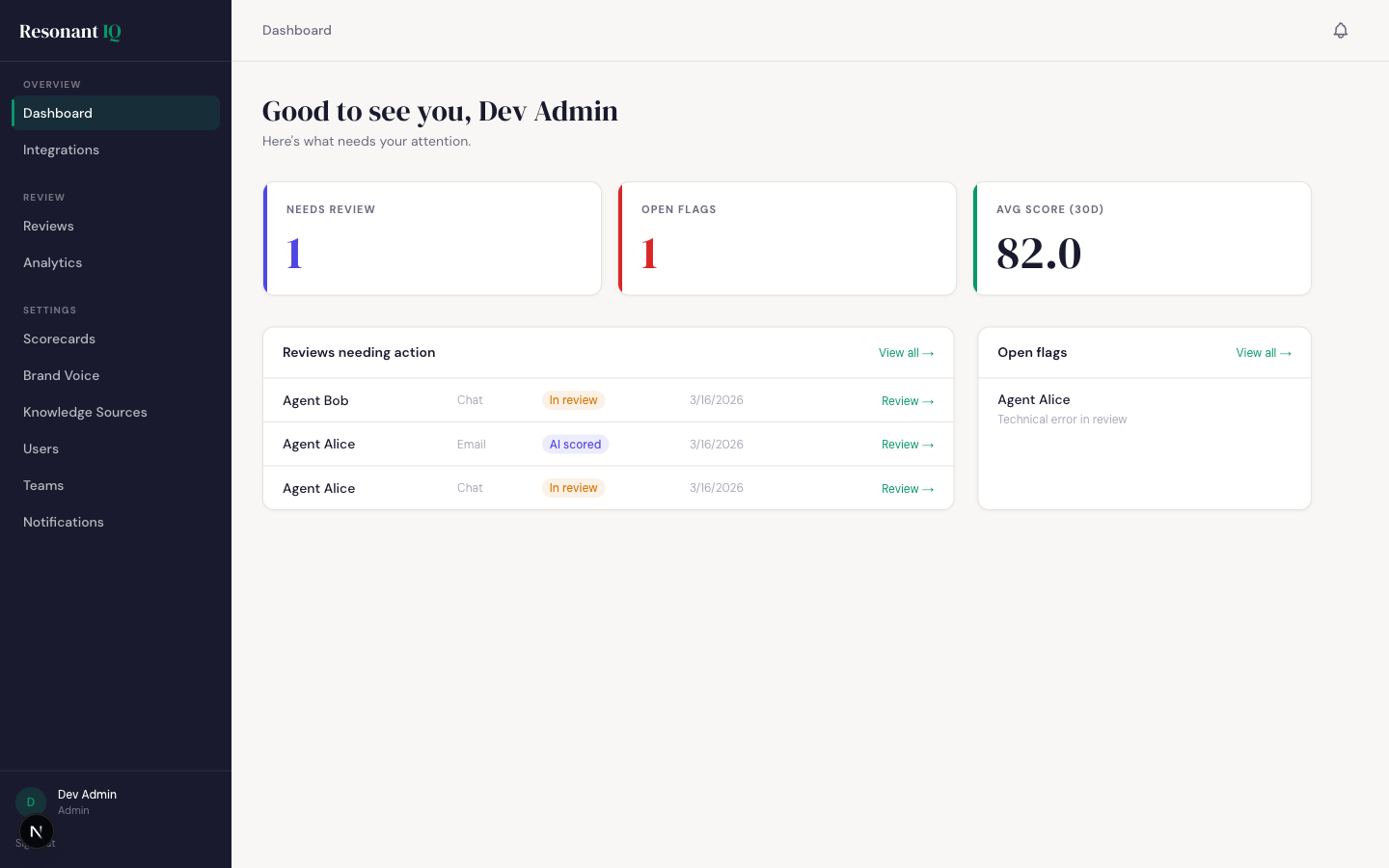 Agents see their scores, per-criterion AI explanations, and coaching notes in one view. Leads are notified when flags are raised. Every review is a coaching opportunity grounded in evidence, not gut feel.